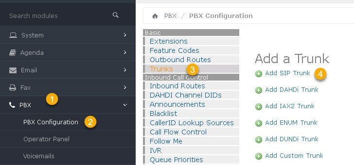 1. از منوی PBX، گزینه PBX Configuration و سپس Trunks را انتخاب کنید.